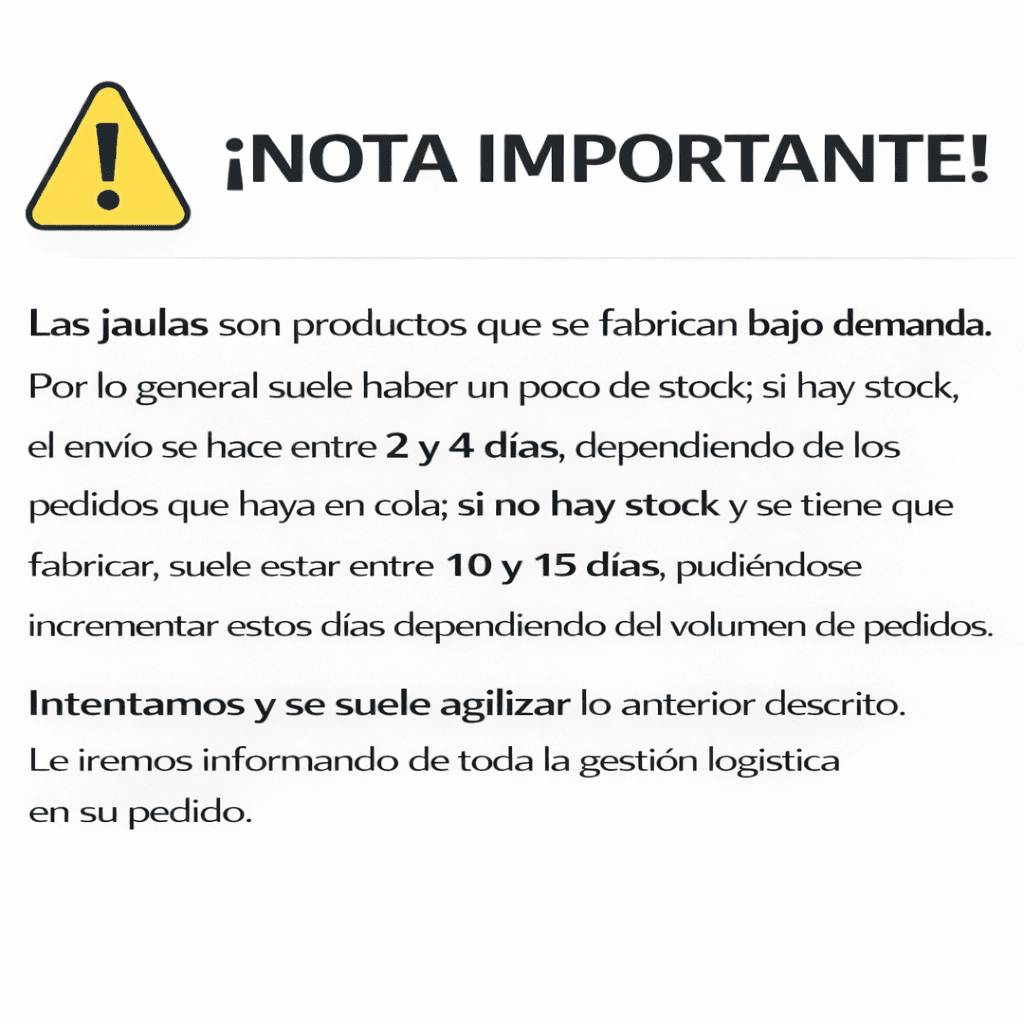La jaula en general está muy bien, lo único que los posaderos podrían ser más gruesos ya que las aves grandes lo necesitan, es cierto que todas las hacen así pero estaría bien no tener que añadir ese detalle aparte.