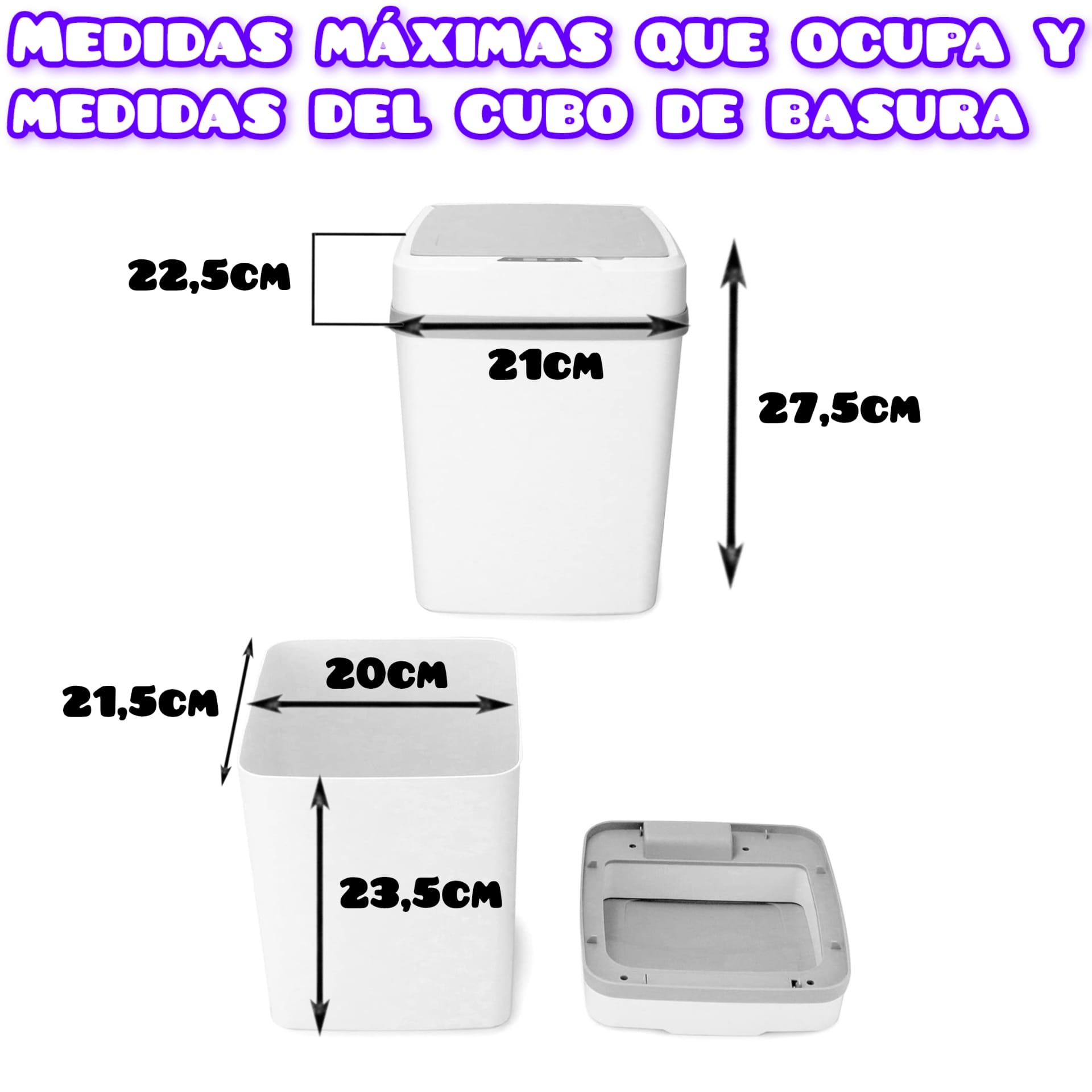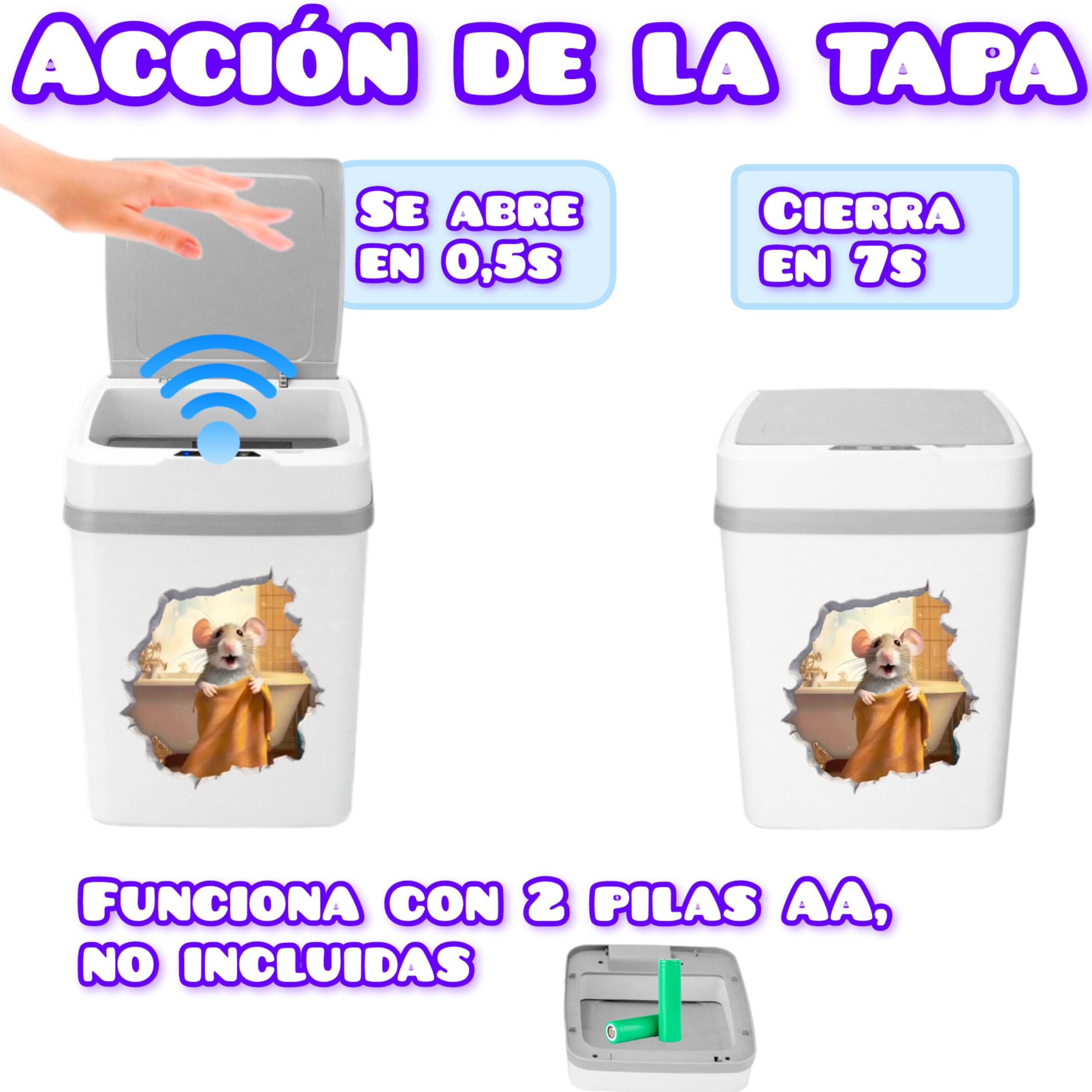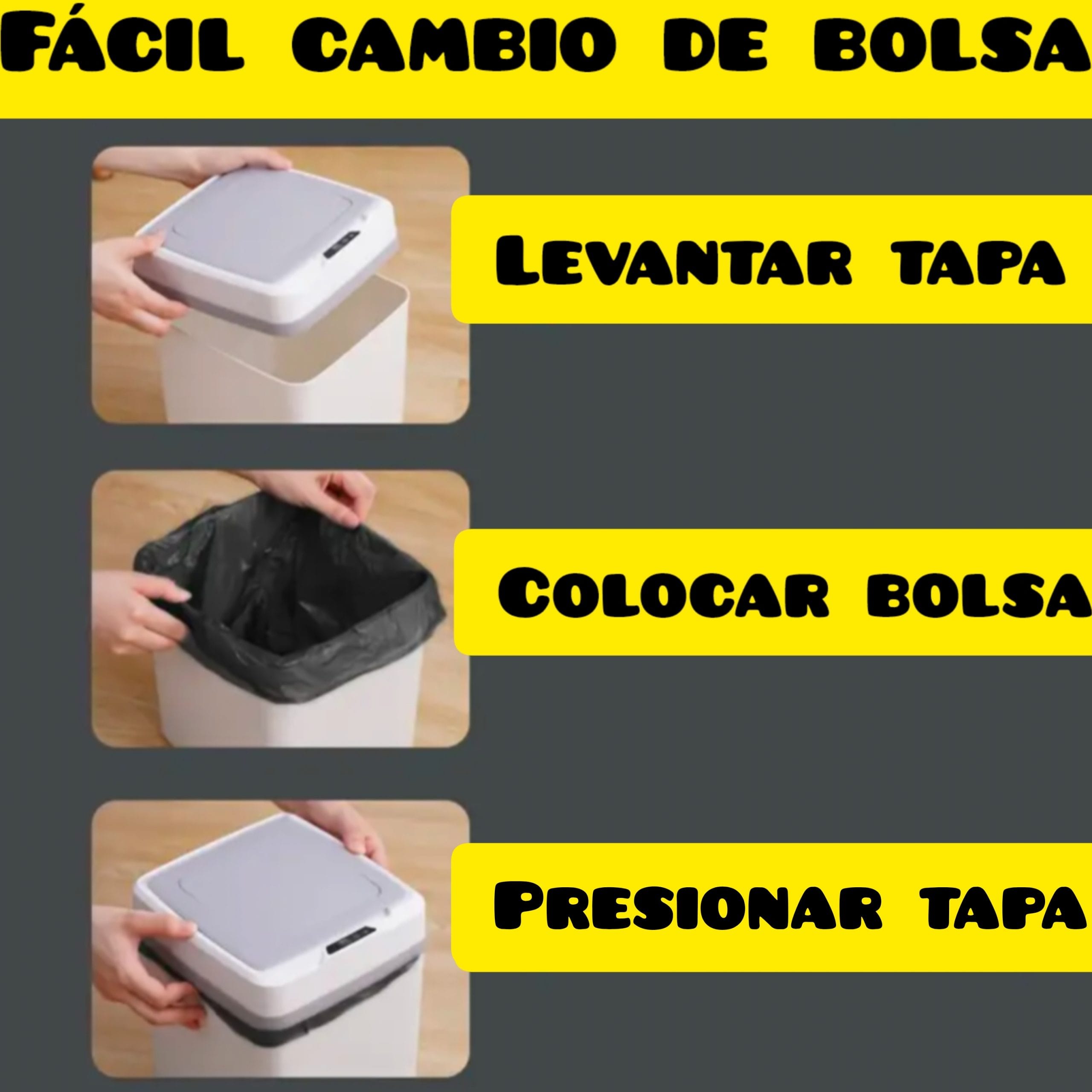 Una papelera fabricada en plástico color blanco, con sensor en la tapa para abrir y cerrar de manera automática. Basta con pasar la mano, rodilla o pie por arriba del sensor para abrirla, pasados 7 segundos aproximadamente se cerrará sola.
