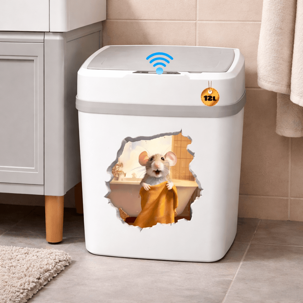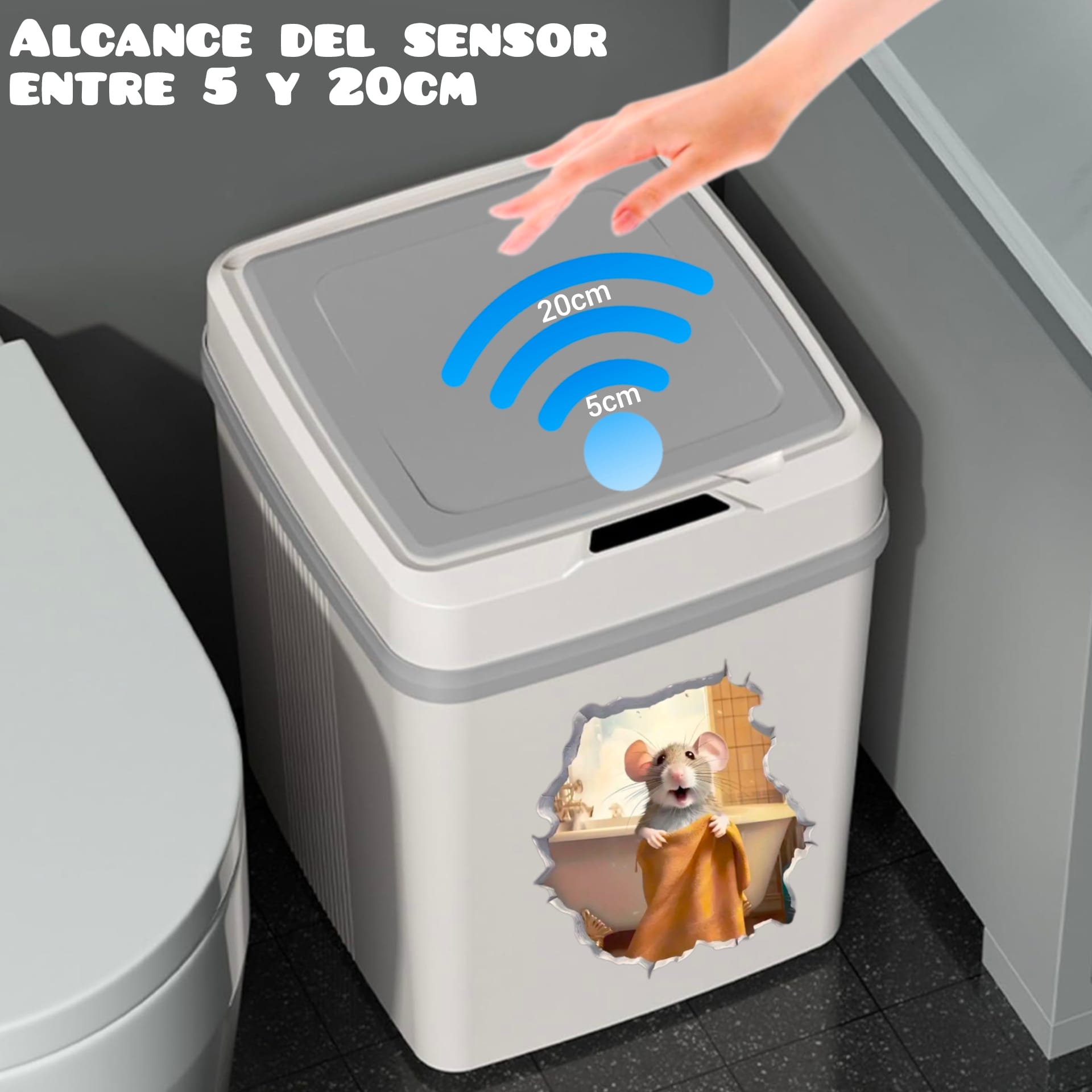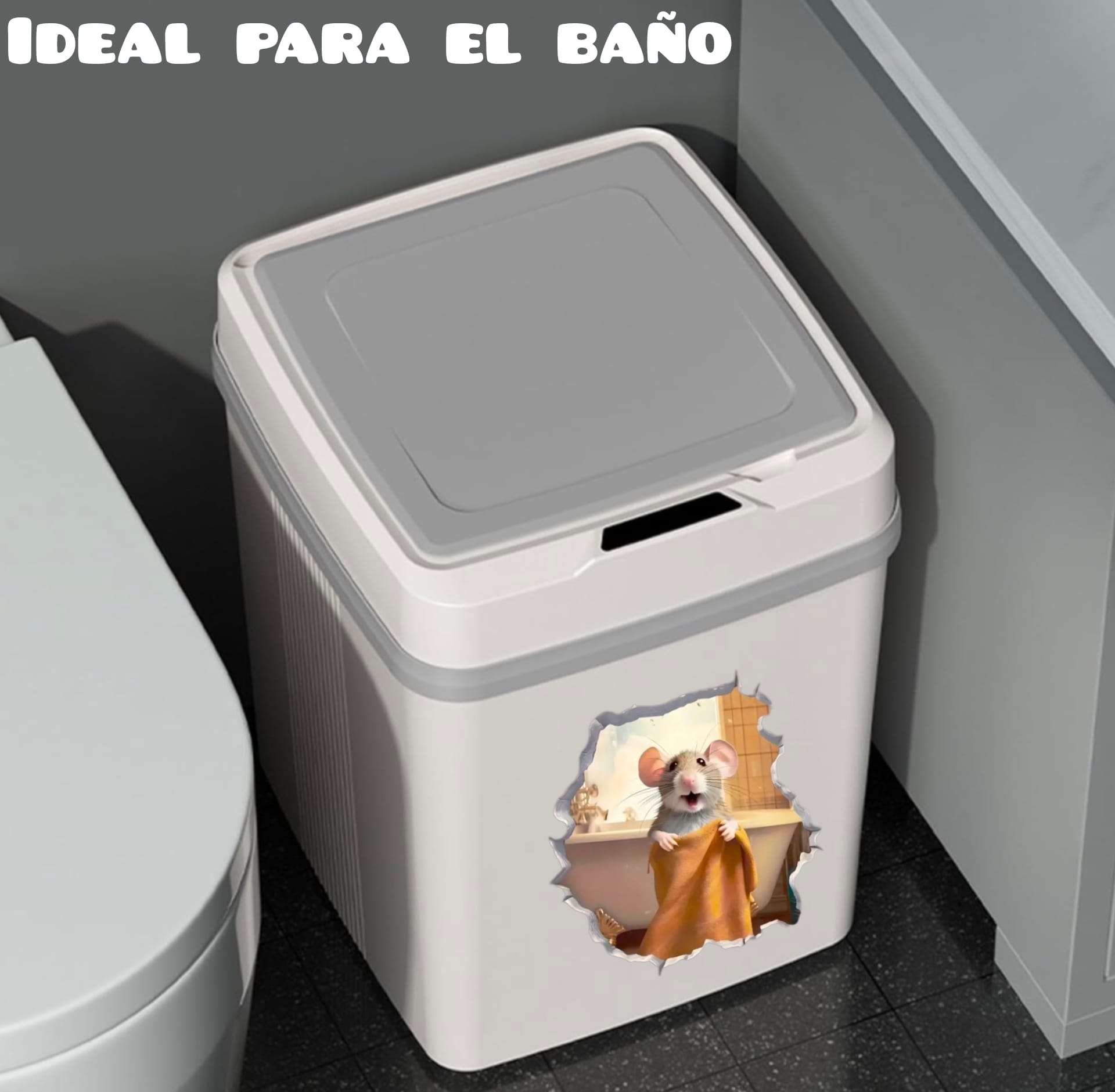 Una papelera fabricada en plástico color blanco, con sensor en la tapa para abrir y cerrar de manera automática. Basta con pasar la mano, rodilla o pie por arriba del sensor para abrirla, pasados 7 segundos aproximadamente se cerrará sola.